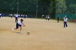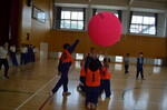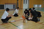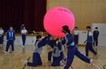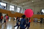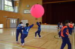 体育館で「キンボール」、運動場で「キックベース」を行い、全学年を縦割りにしてチームを構成して実施しました。