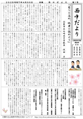 新年度になって1カ月がたち、委員会の仕事にも慣れてきたと思います。より一層生徒会活動を活性化し、よりよい山崎西中学校にしていきましょう。