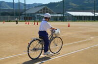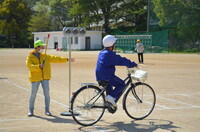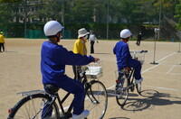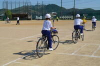 説明を聞いた後は、実際に自転車に乗って、グラウンドの模擬道路を用いて確認を行いました。